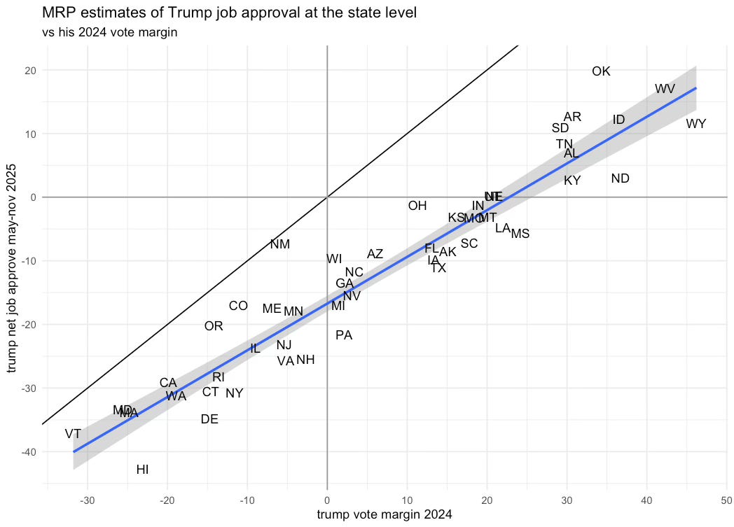The charts below show estimated Trump approval (a) overall and (b) for his handling of inflation, for each state, combining all the interviews we conducted in 2025 (from May through November). Trump’s approval overall among adults is pretty abysmal (positive in just 11 states), but it’s downright catastrophic on inflation; Trump’s only positive rating is in Oklahoma.